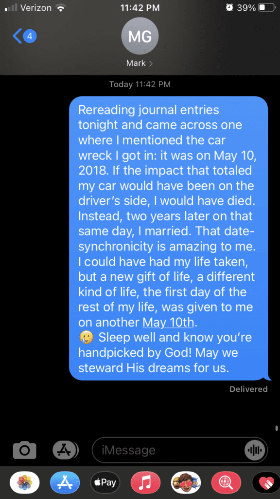 Sometimes I text Mark when he’s asleep (#nightowlproblems) because I just can’t wait until the next day to tell him something. As my message shows, I’d forgotten the day of my car accident—an event I don’t often mention. I remember getting T-boned and then seeing that my sunglasses on the seat next to me had both lenses popped out. I don’t remember much else except that I had music playing: “Great Are You Lord” by All Sons and Daughters. The chorus took on new meaning for me that day: